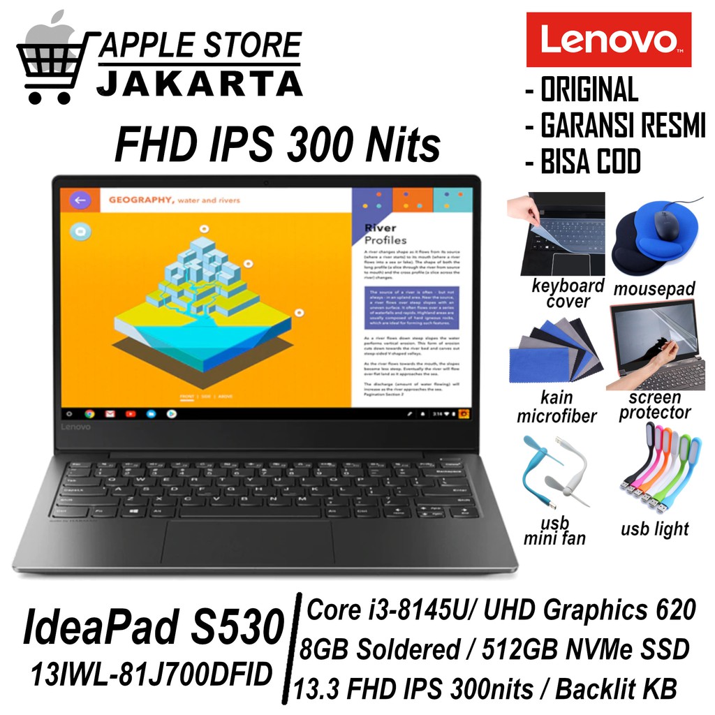Lenovo lenovo ideapad s530 13iwl dfid i3 8145u win10 8gb 512gb ssd 13 3 fhd intel hitam cp538. Lenovo ideapad s530 13iwl 46id ultrabook andal bertenaga intel core i7 8565u lenovo indonesia belum lama ini telah meluncurkan jajaran laptop terbarunya yang ditenagai oleh prosesor intel generasi whiskey lake salah satunya adalah ideapad s530 13iwl 46id ultrabook ini hadir dengan dimensi yang tipis dan bobot yang sangat ringan dengan balutan casing aluminium yang kokoh. It has an 8 hour battery with rapid recharge technology. Fast and secure the sleek ideapad s530 is ideal for work.