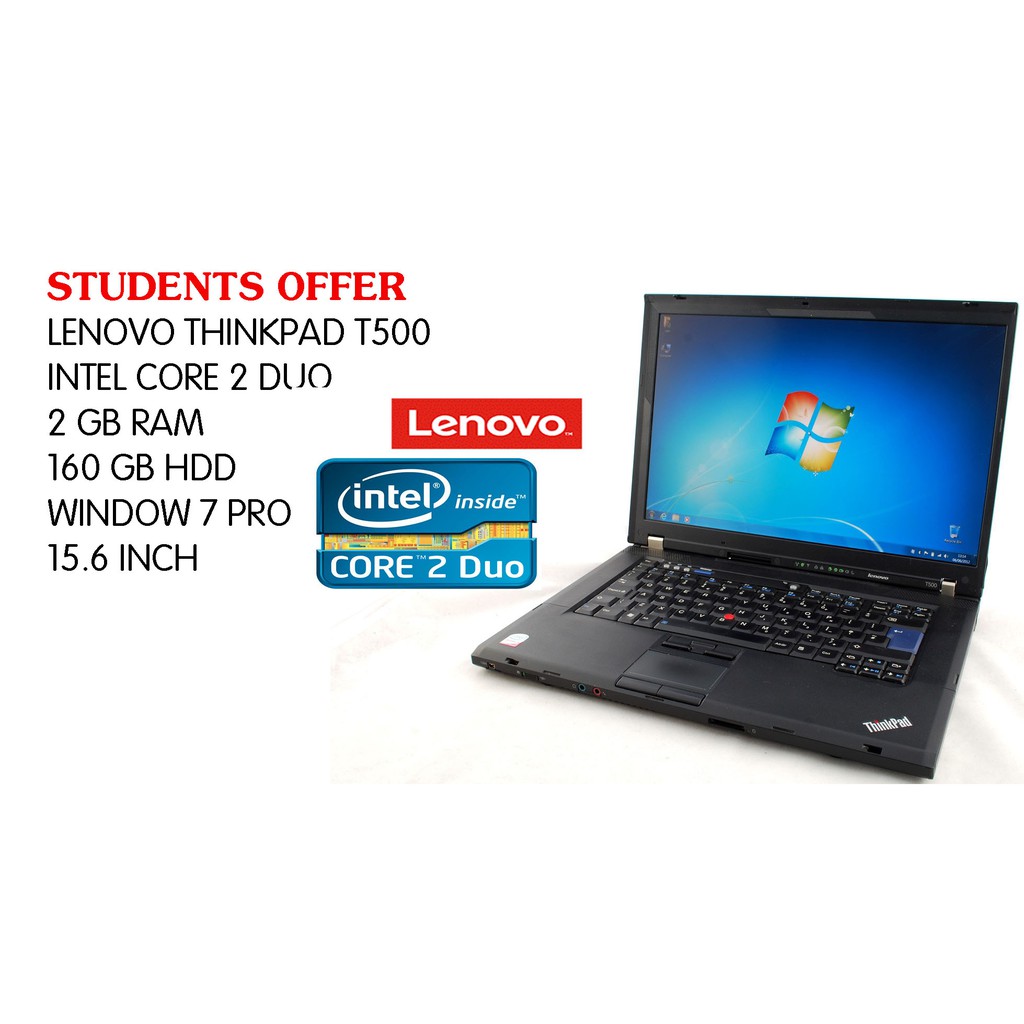 Model lenovo thinkpad t500 15 4 core 2 duo t9400 2 gb ram 160 gb hdd.
